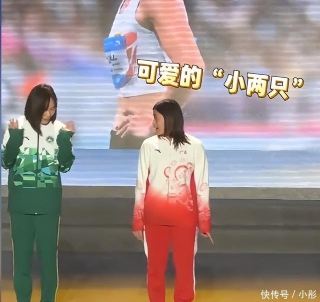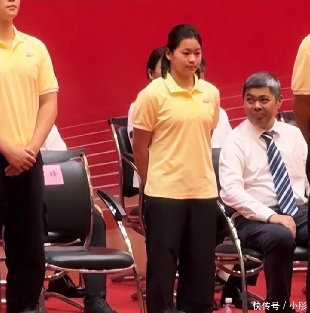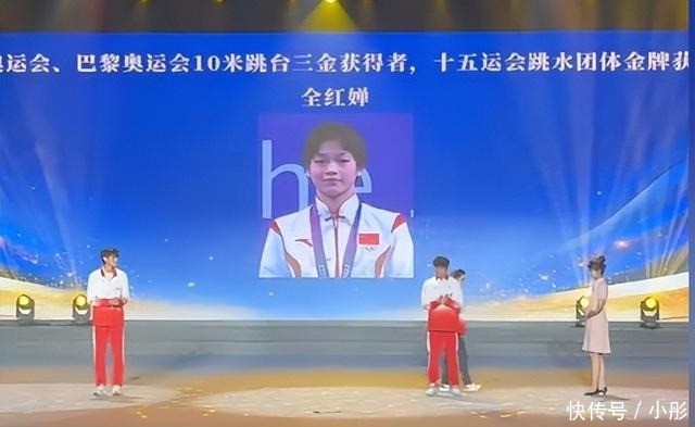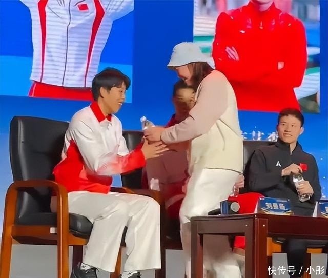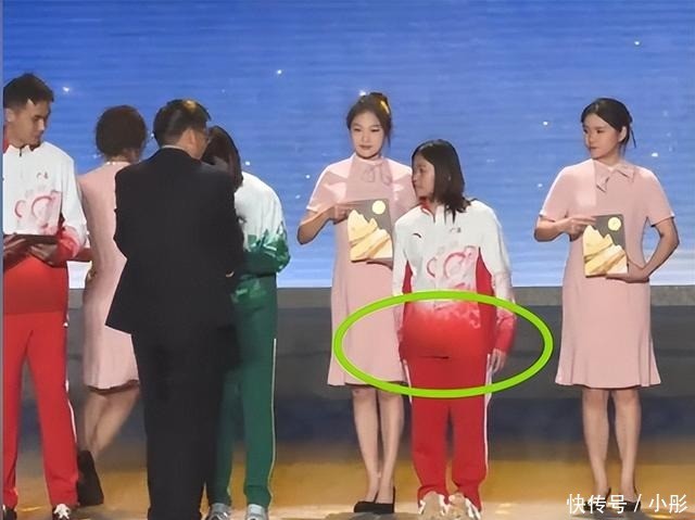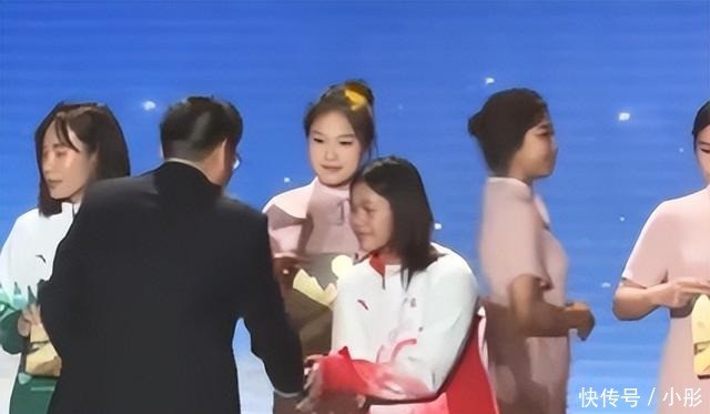 全红婵被点名后,乖巧地上台恭候受奖,还和控制的吕艳兰聊起暗暗话。
