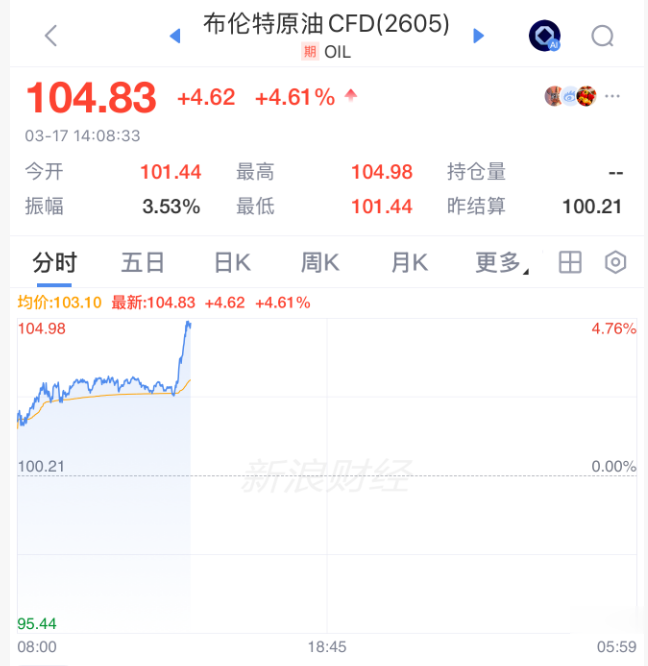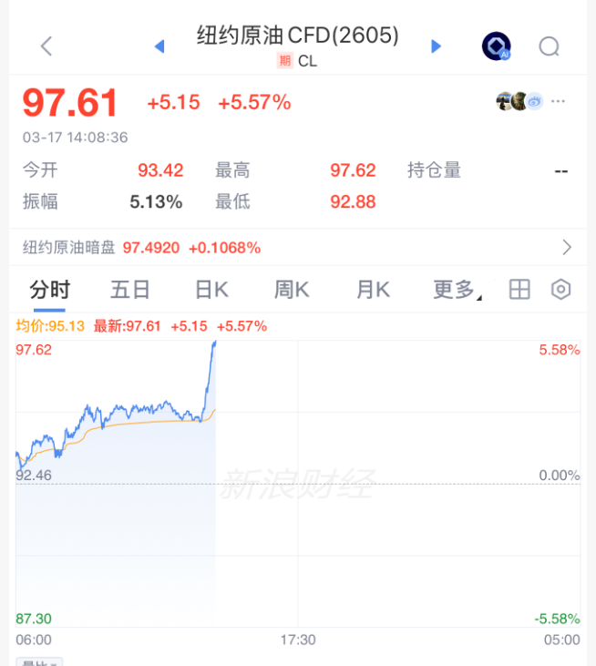 3月17日午后,外洋油价直线拉升,布伦特原油涨超4%,纽约原油涨超5%。