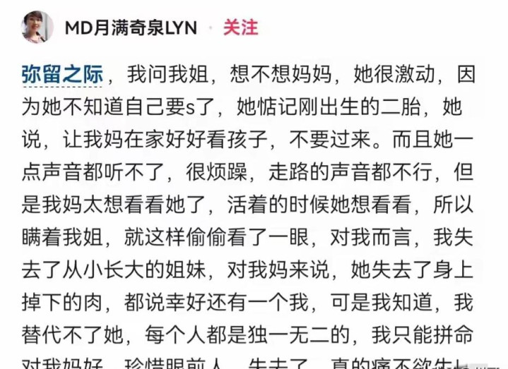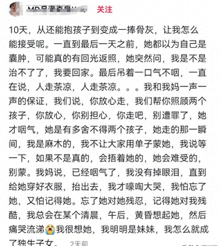 视频里说的,是她亲姐姐的事,姐姐40岁,刚剖腹产生下二胎,一家东说念主还千里浸在答允里,谁能念念到,从还能抱着孩子,还能谈话,到临了形成一捧骨灰,也就短短十天,孩子还没朔月,姆妈就不在了,妹妹在驳倒区写的那些话,看着让东说念主心里发紧,10天,从还能抱孩子到形成一捧骨灰,让我何如招揽。