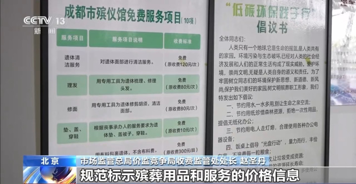 阛阓监管总局价监竞争局收费监管处处长赵圣丹:各地在地市级以上民政部门官网,全面公示殡葬服务机构提供的服务样式、收费圭臬、服务内容和销售的殡葬用品价钱、计价单元等身分,冲破了殡葬行业长期存在的信息差,推动造成阳光透明、法度有序的价钱顺序。